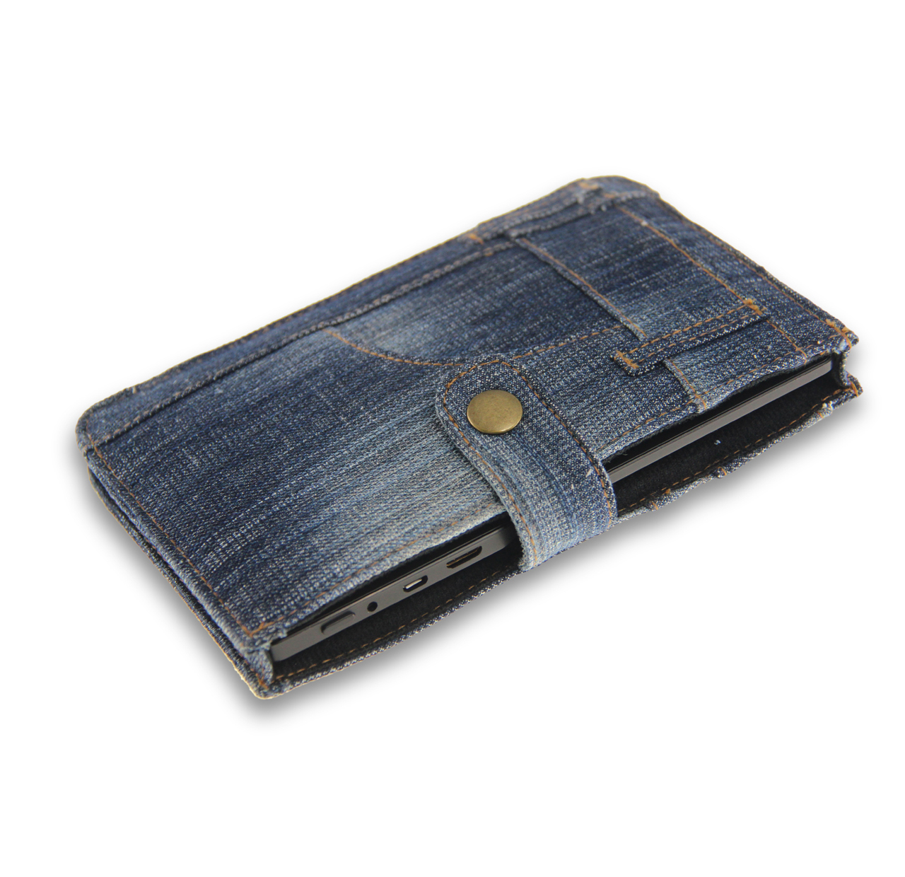 Leve seu Tablet para qualquer lugar com estilo e charme. Produzido com Jeans verdadeiro. Divirta-se mostrando para seus amigos e guarde com total segurança seu Tablet. Interior forrado que protege contra arranhões de outros objetos e mantém limpo. Fecho com botão de pressão que impede saída acidental do tablet.