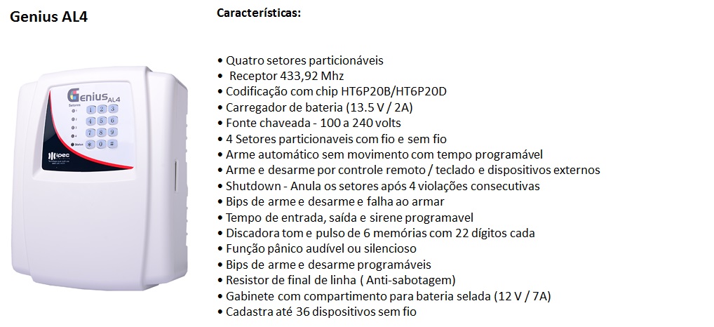 ATENÇÃO: Os preços ofertados no site podem ser alterados a qualquer momento, sem aviso prévio, devido as oscilações de mercado, câmbio e matéria prima. Produtos sujeito à disponibilidade de estoque. Central alarme Genius AL4