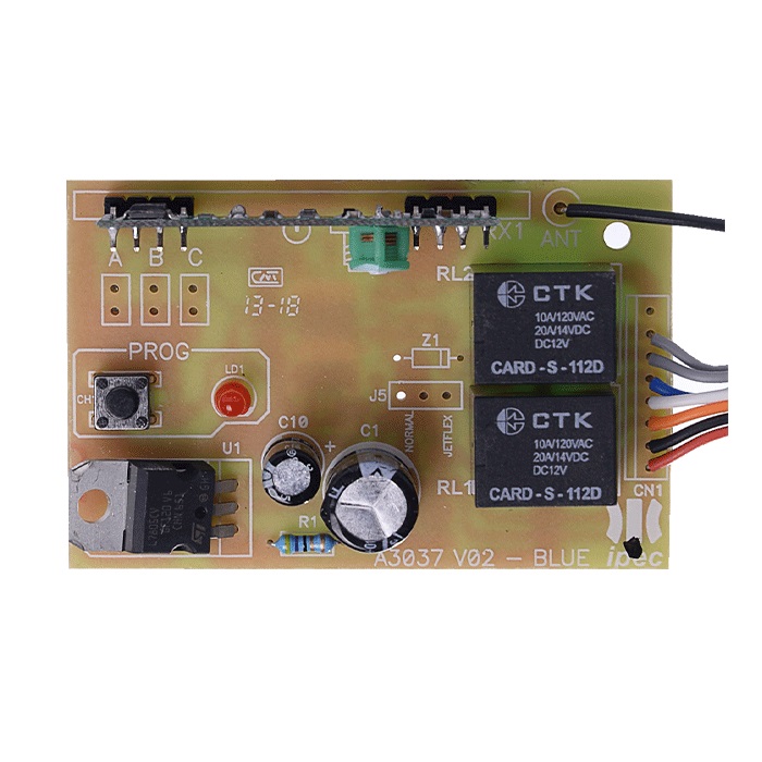 • Possui 1 relé de contato C/NA/NF (RL1) • Possui 1 relé de contato C/NA (RL2) • Cabo Flat de 7 vias sem conector • Tensão de alimentação: 12 / 24 VDC • Fácil programação • Função pulso • Cadastra até 340 controles remotos que utilizam o Encolder HT 6P20B • Cadastra sensores magnéticos code learn • Dimensões Caixa: A 73mm x L 67mm x P 26mm Ao pressionar o botão do controle remoto o relé é acionado