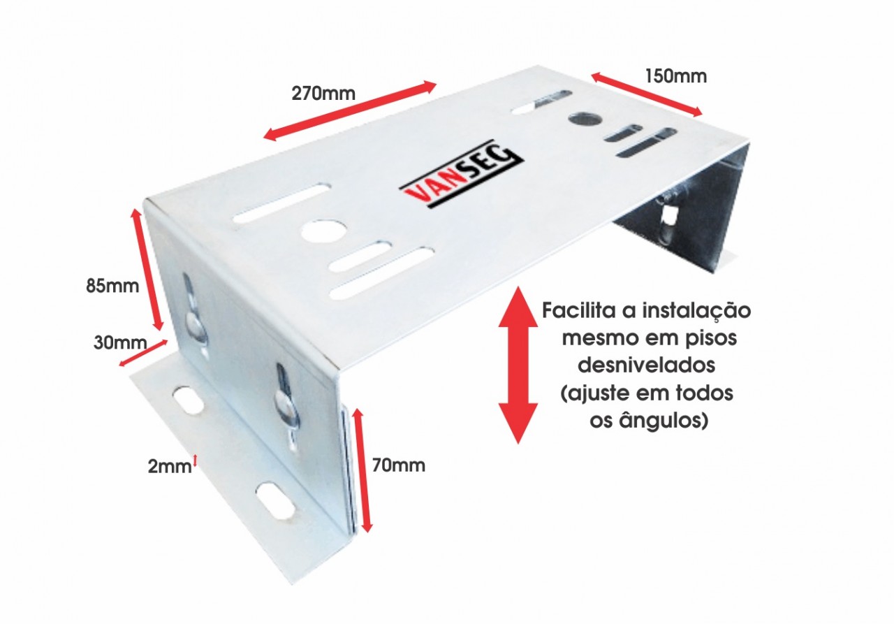 O suporte base para fixação de automaticadores para portões deslizantes, é confeccionado em chapa galvanizada.